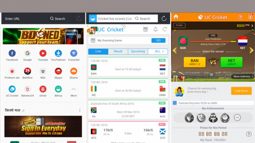 Besides, UC Browser brought a brand new UC Cricket for Bangladeshi users in the end of February 2016. This new version of UC Cricket is specially designed for Bangladeshi users with new interface and local cricket content, such as live scores, headlines of most popular matches in Bangladesh and cricket guessing games.