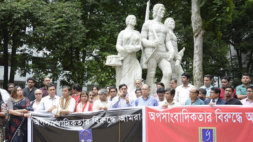 Chair of the MCJ department and general secretary of DUMCJAA Professor Mofizur Rahman conducted the human chain.