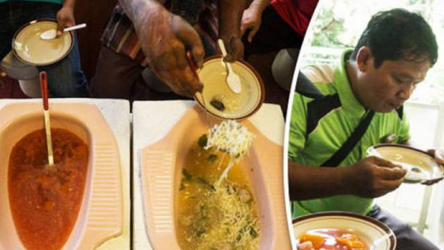 Guests at the ‘Jamban Cafe’ sit on upright toilets around a table where food is served in squat loos.