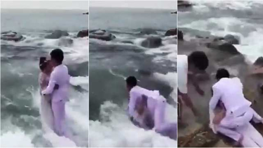 To capture a beautiful romantic moment against the golden rays with foamy water on the beach, the shutterbug decided to make them stand on a rock. The rock was quite close to the water, and before they knew it, the bride was swept off her feet in the ocean by a strong wave! The painful sight was shared online and people couldn’t stop laughing. While many felt sorry for the bride, and her expensive bridal gown, others just found it hilarious.
