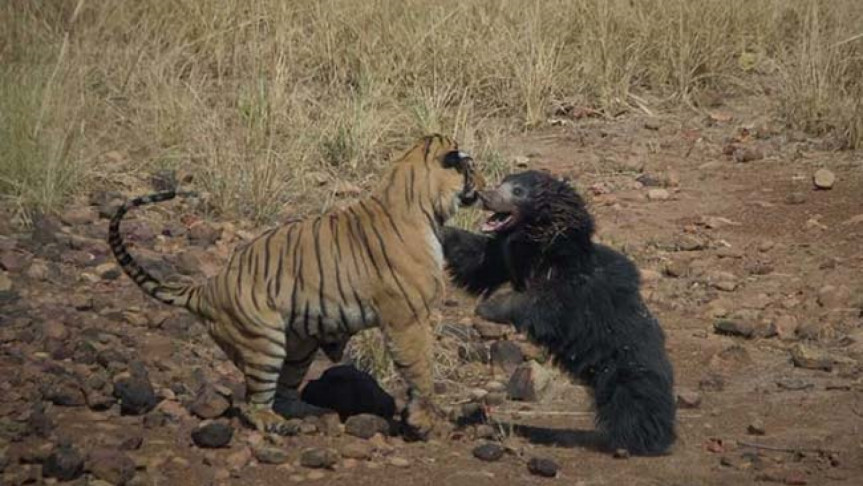 Both the tiger and sloth bear suffered injuries in the attack. The young cub ran away during the fight.