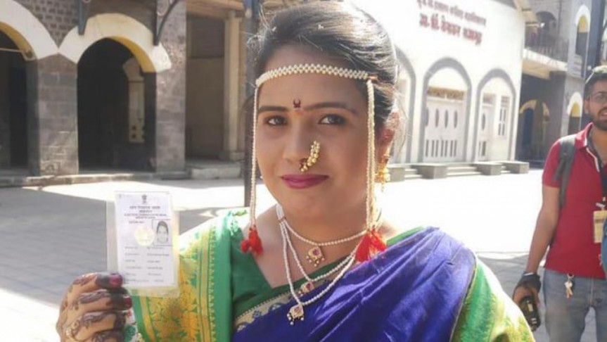 The bride was seen showing her identity card during the third phase of the general elections in Pune.