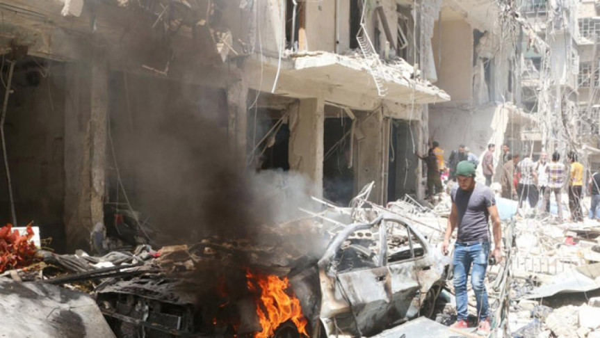 People inspect the damage at a site hit by airstrikes, in the rebel-held area of Aleppo’s Bustan al-Qasr, Syria on 28 April 2016. Photo: Reuters