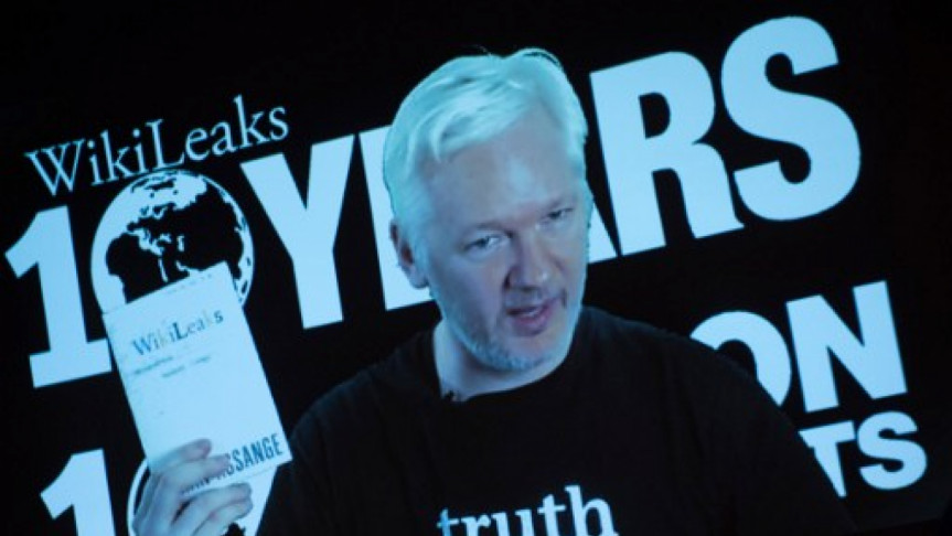 Julian Assange, founder of the online leaking platform WikiLeaks, is seen on a screen as he addresses journalists via a live video connection during a press conference on the platform's 10th anniversary on 4 October 2016 in Berlin. Photo: AFP