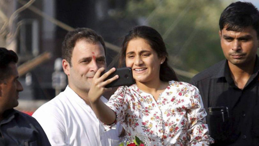 A girl got aboard the van of Congress vice president Rahul Gandhi and clicked selfies with him during his road show in Bharuch in south Gujarat on Wednesday.