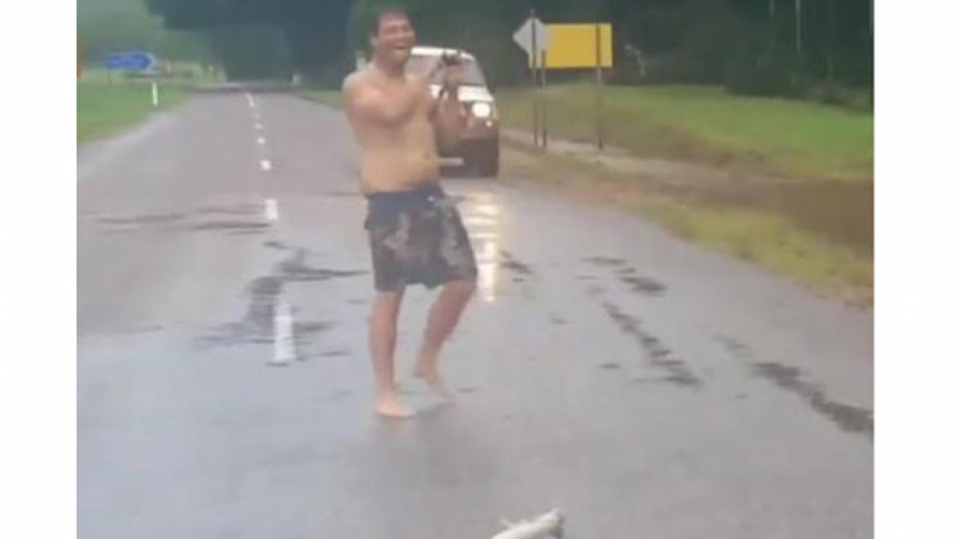An Australian man took advantage of flooding in his area by casting his line from a water-logged road and catching a fish.